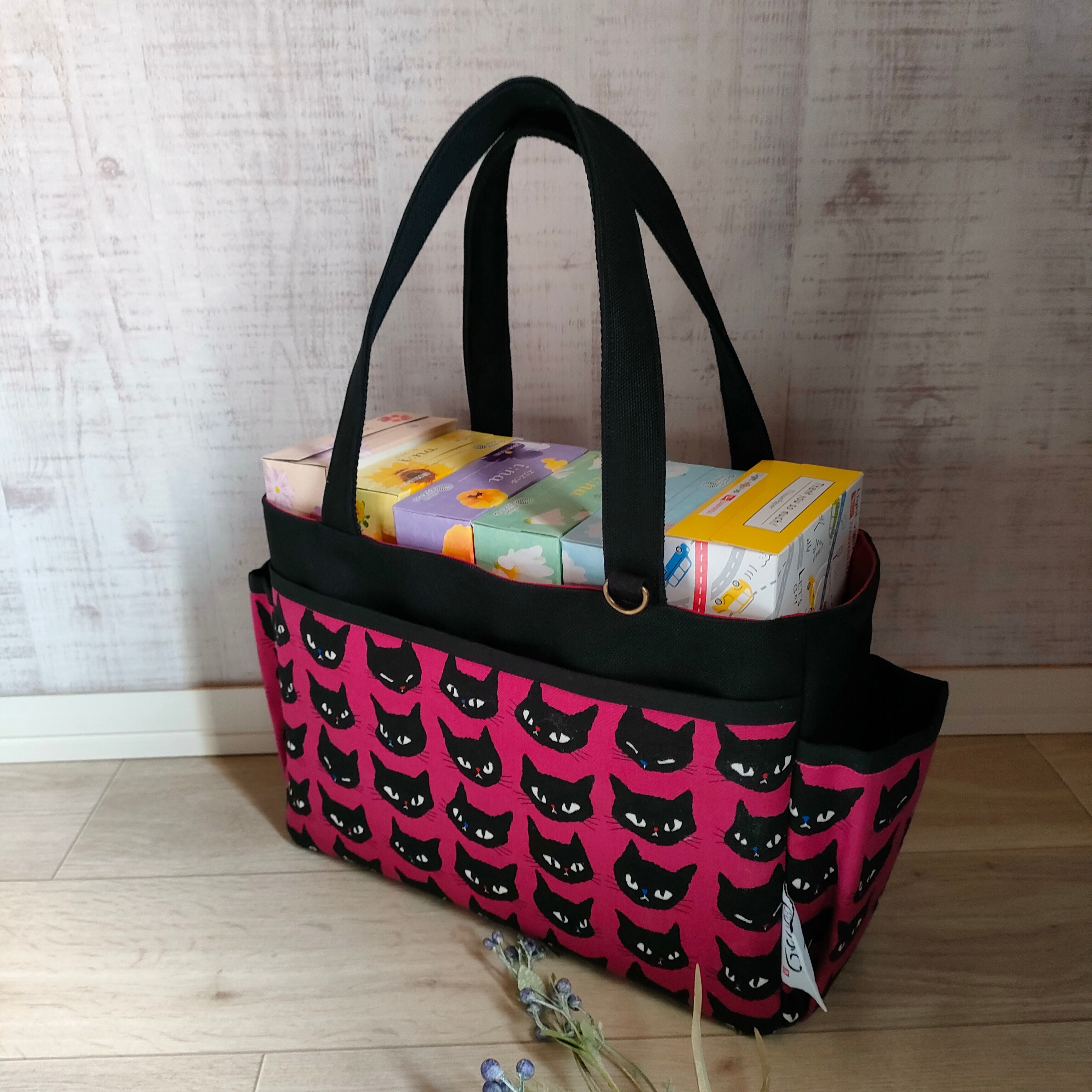 サイドポケット付きトートバッグ小 トートバック 猫のトートバック 御朱印帳バック 御朱印帳 お弁当バック 猫 ピンク
