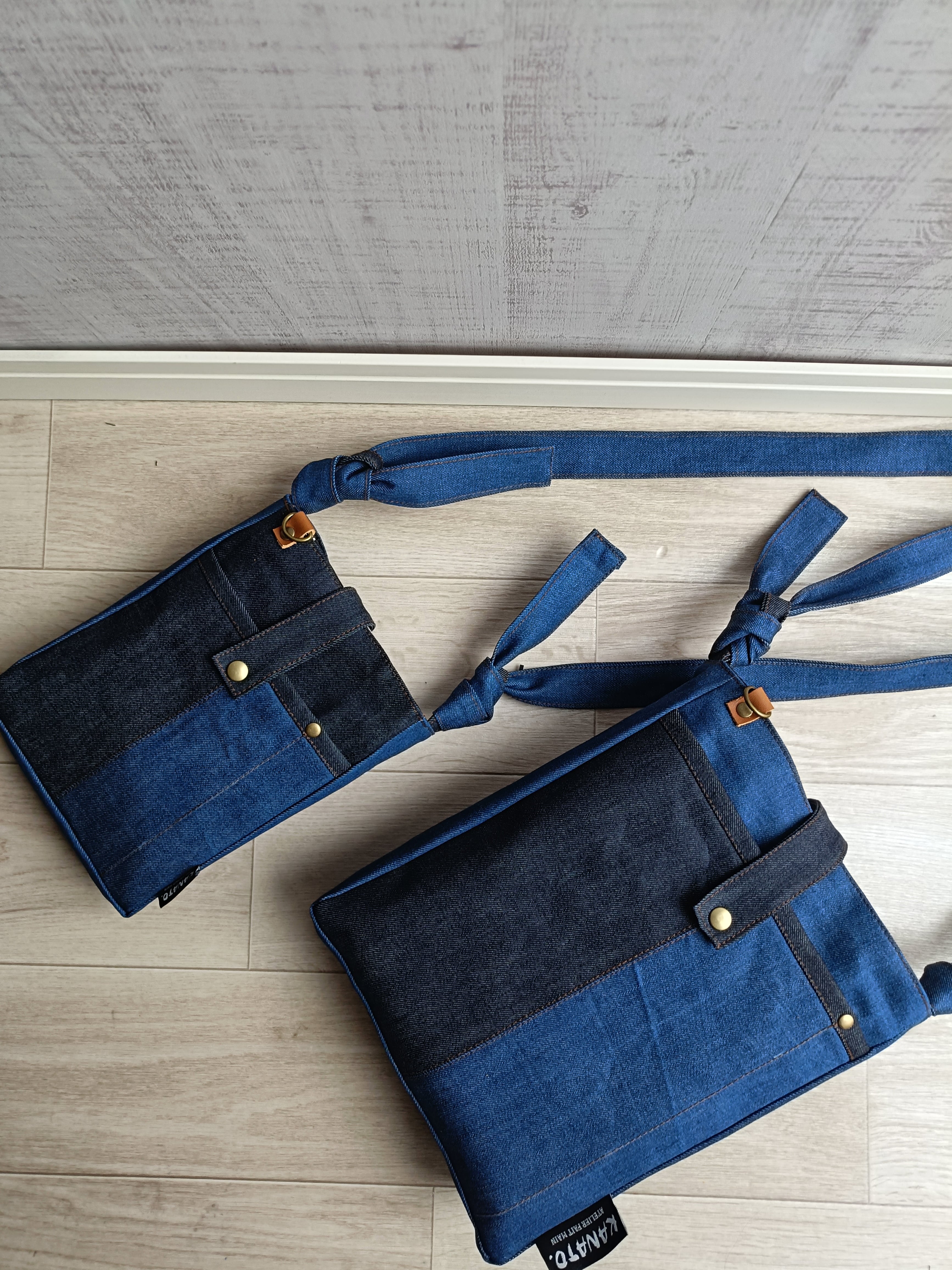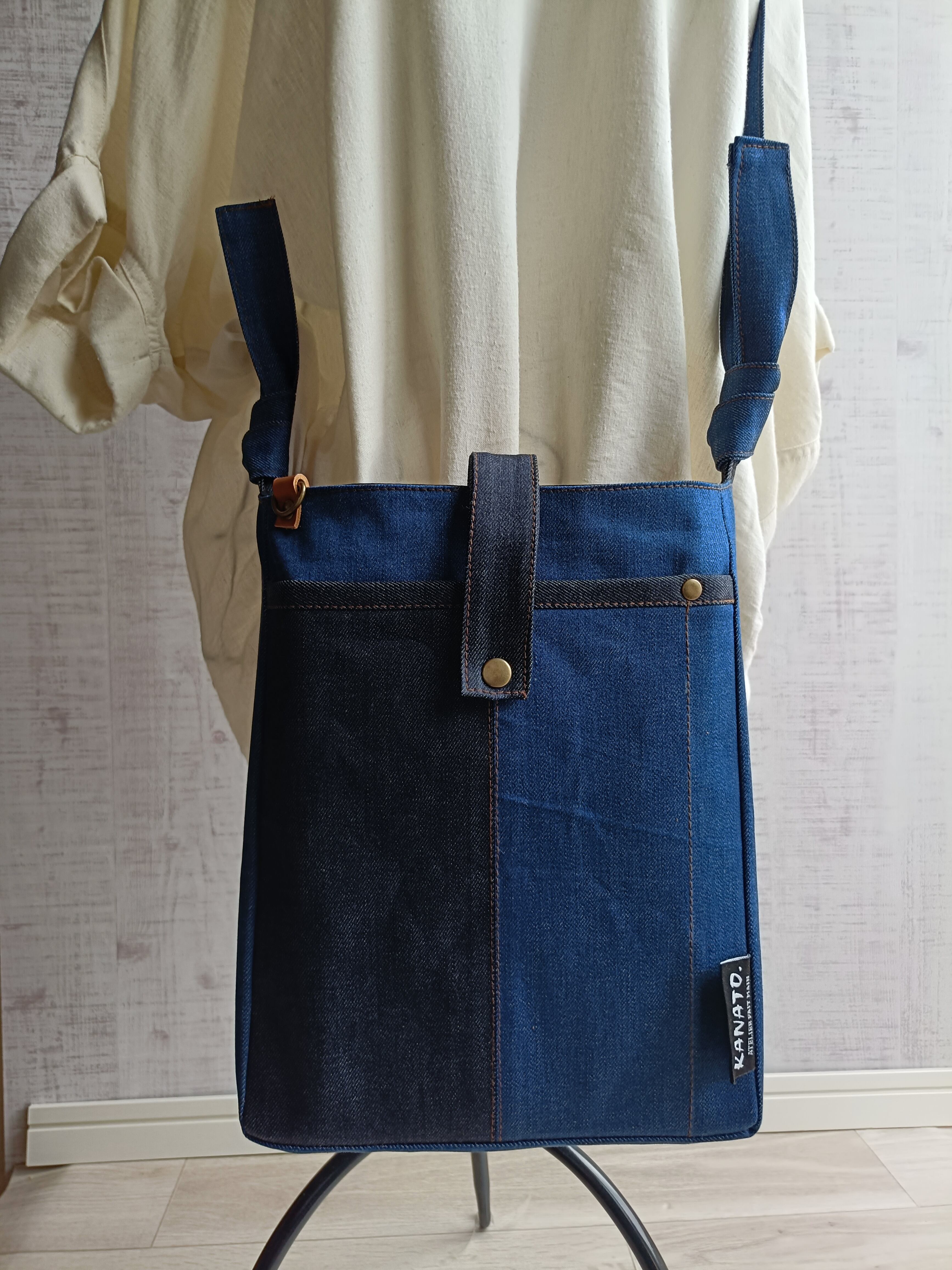旅、お買い物の相棒になってくれる、デニム素材ののサコッシュポシェットを頭陀袋風にショルダーストラップを付けました。