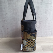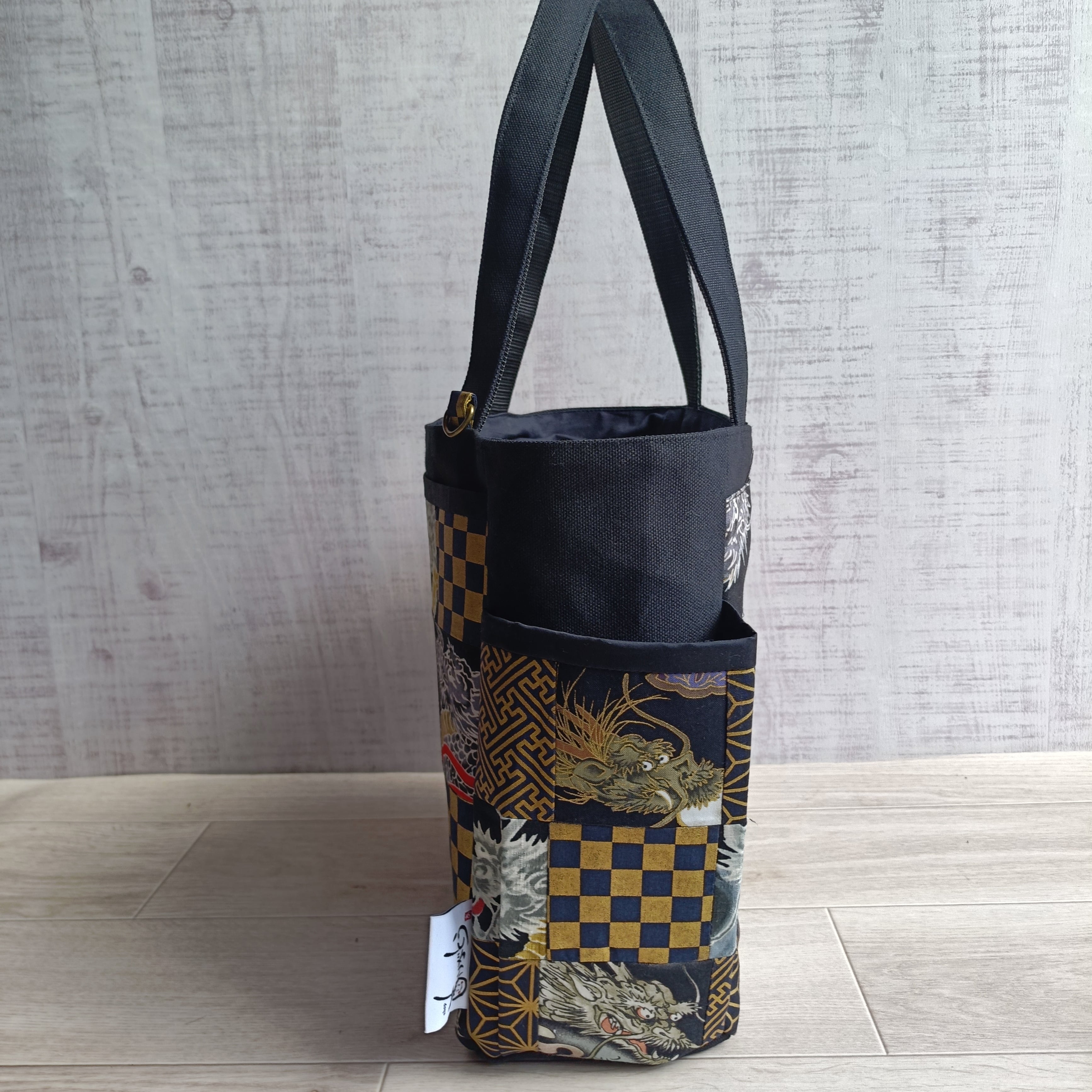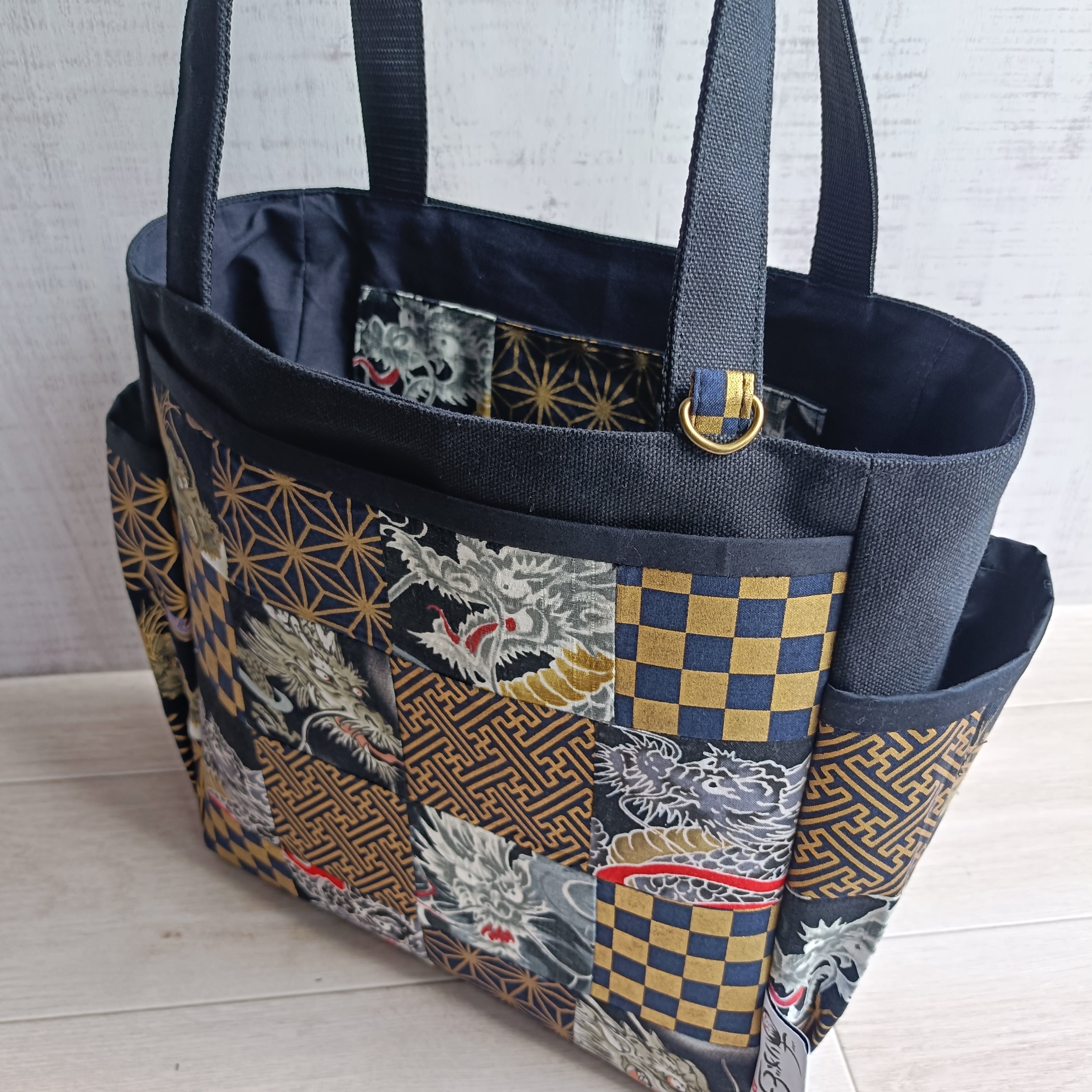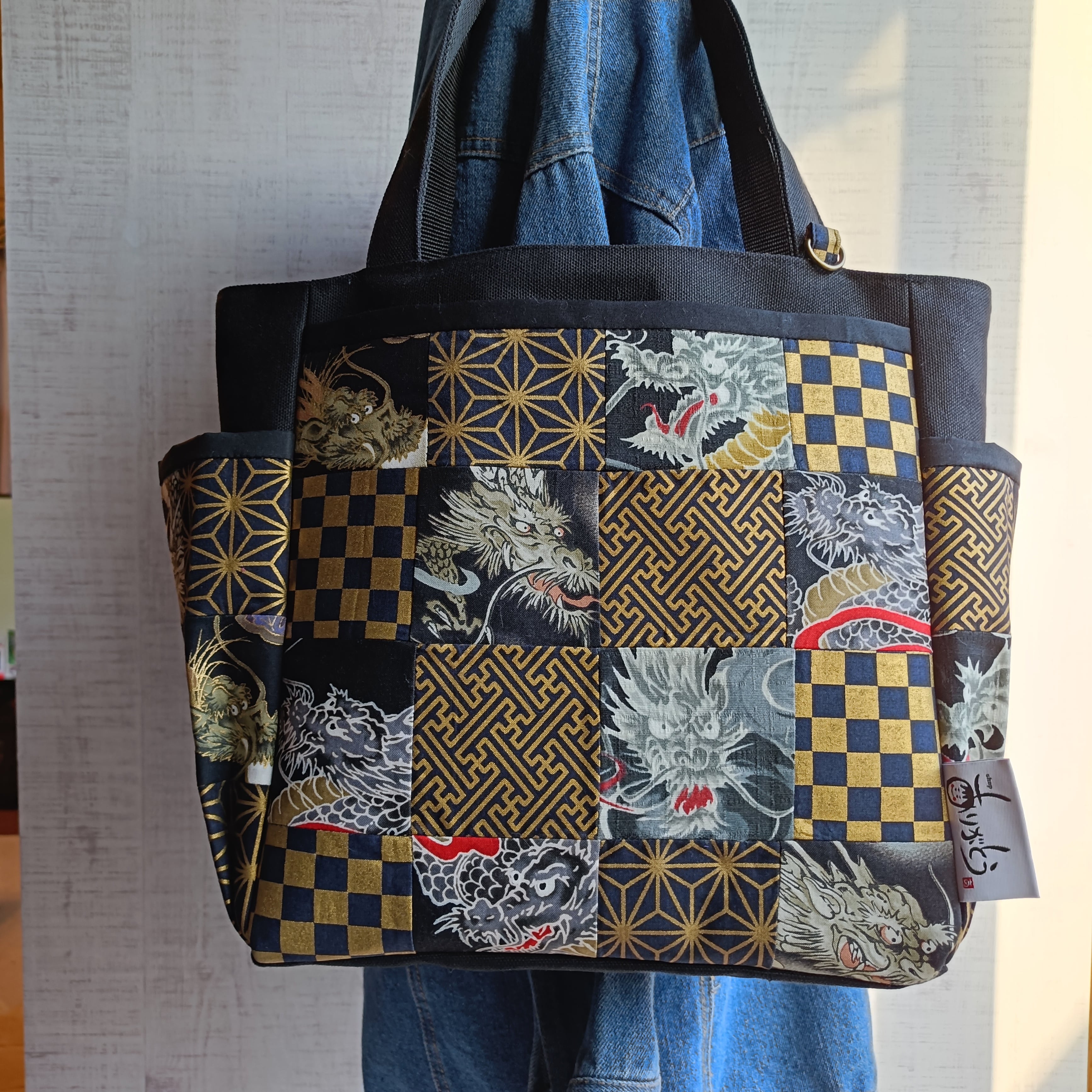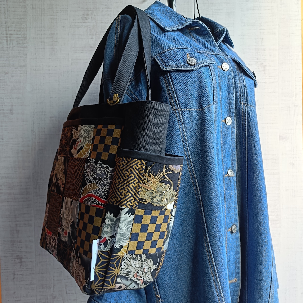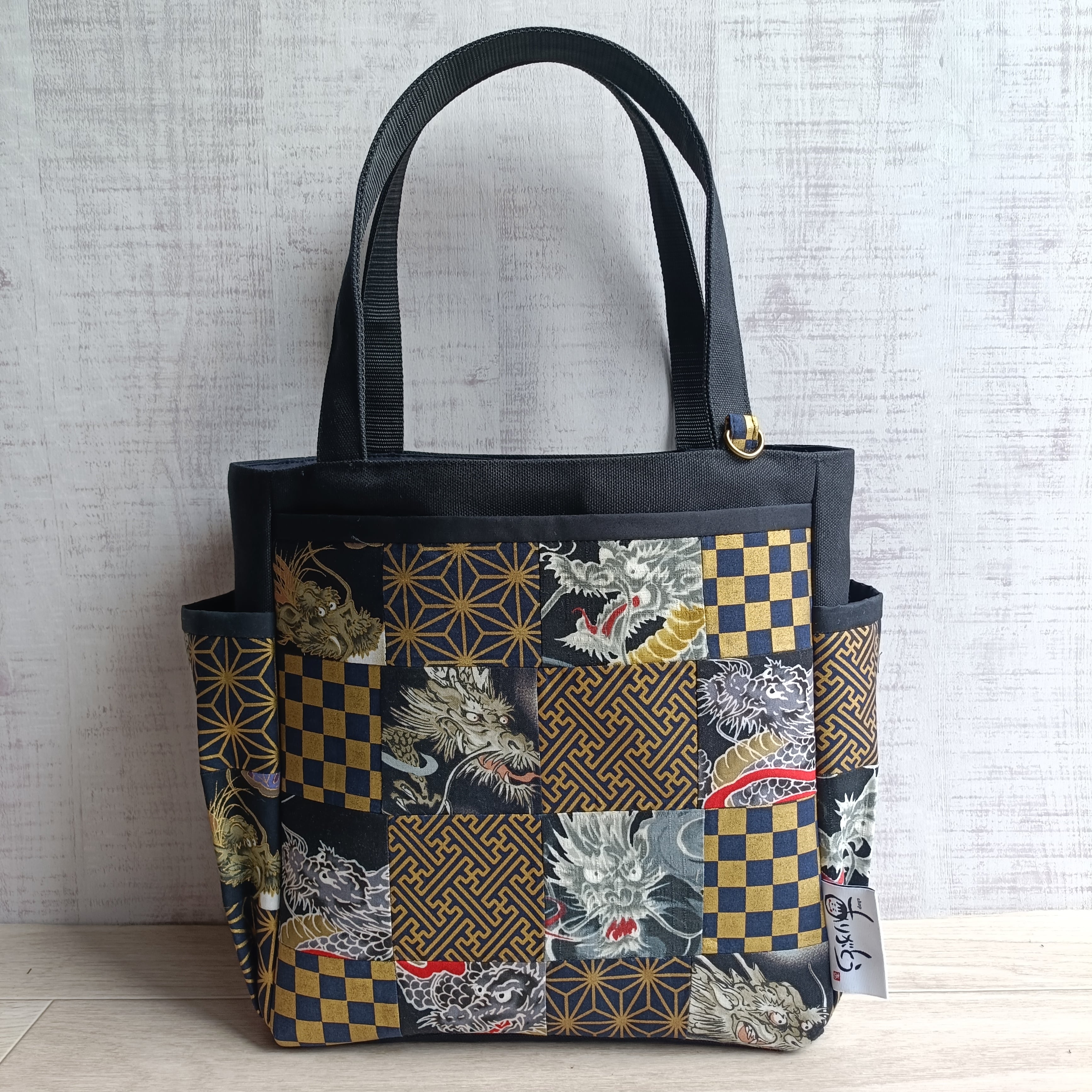 サイドポケット付きトートバッグ中 龍 龍柄トートバック 龍のトートバック パッチワーク 龍のバック