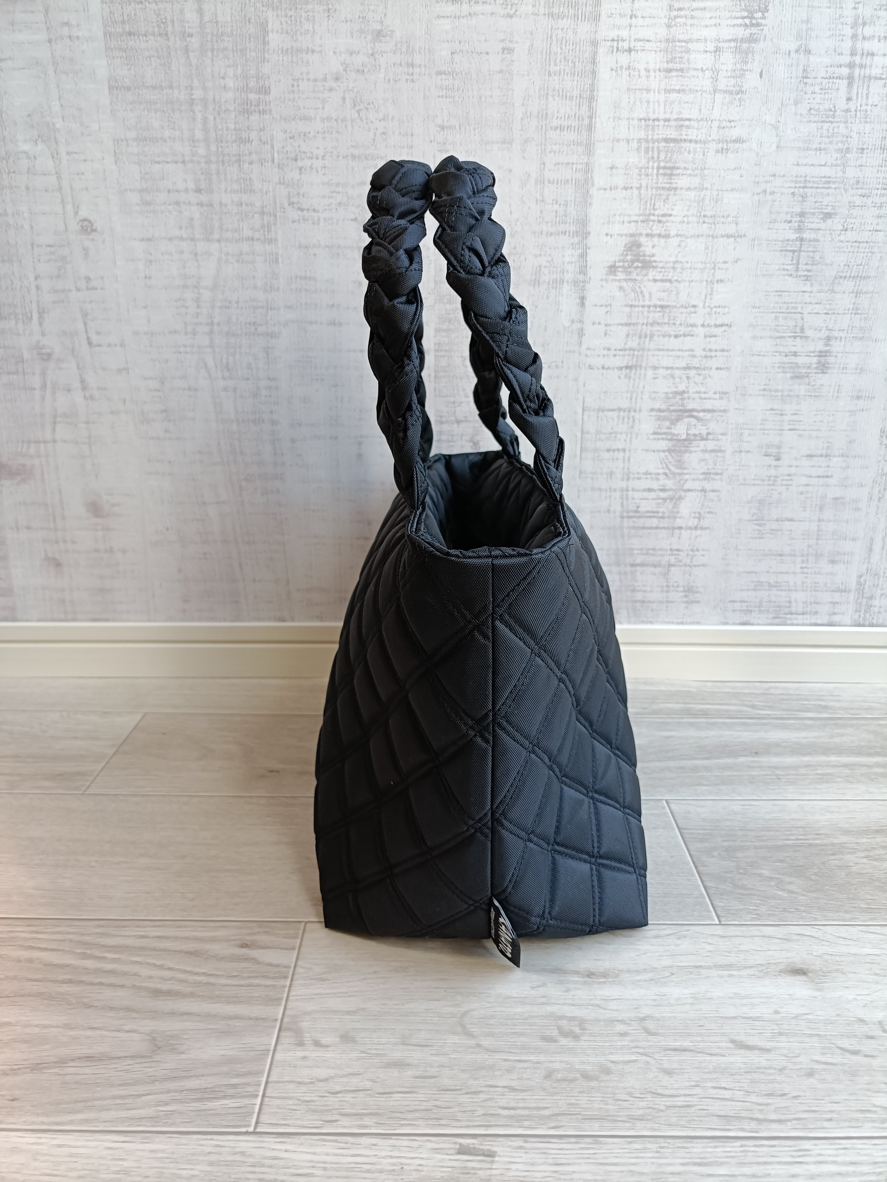 流行の三つ編みデザインが特徴のキルティングトートバッグ、ナイロンとポリエステルの両面加工により、しっかりとした素材感が魅力です。このバッグは、カジュアルからフォーマルまで使い勝手も抜群です!