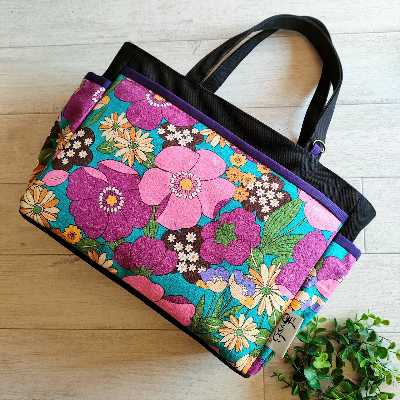 サイドポケット付きトートバッグ大 花柄バック ボタニカルトートバック 花柄トートバック 春のトートバック レトロ レトロフラワー