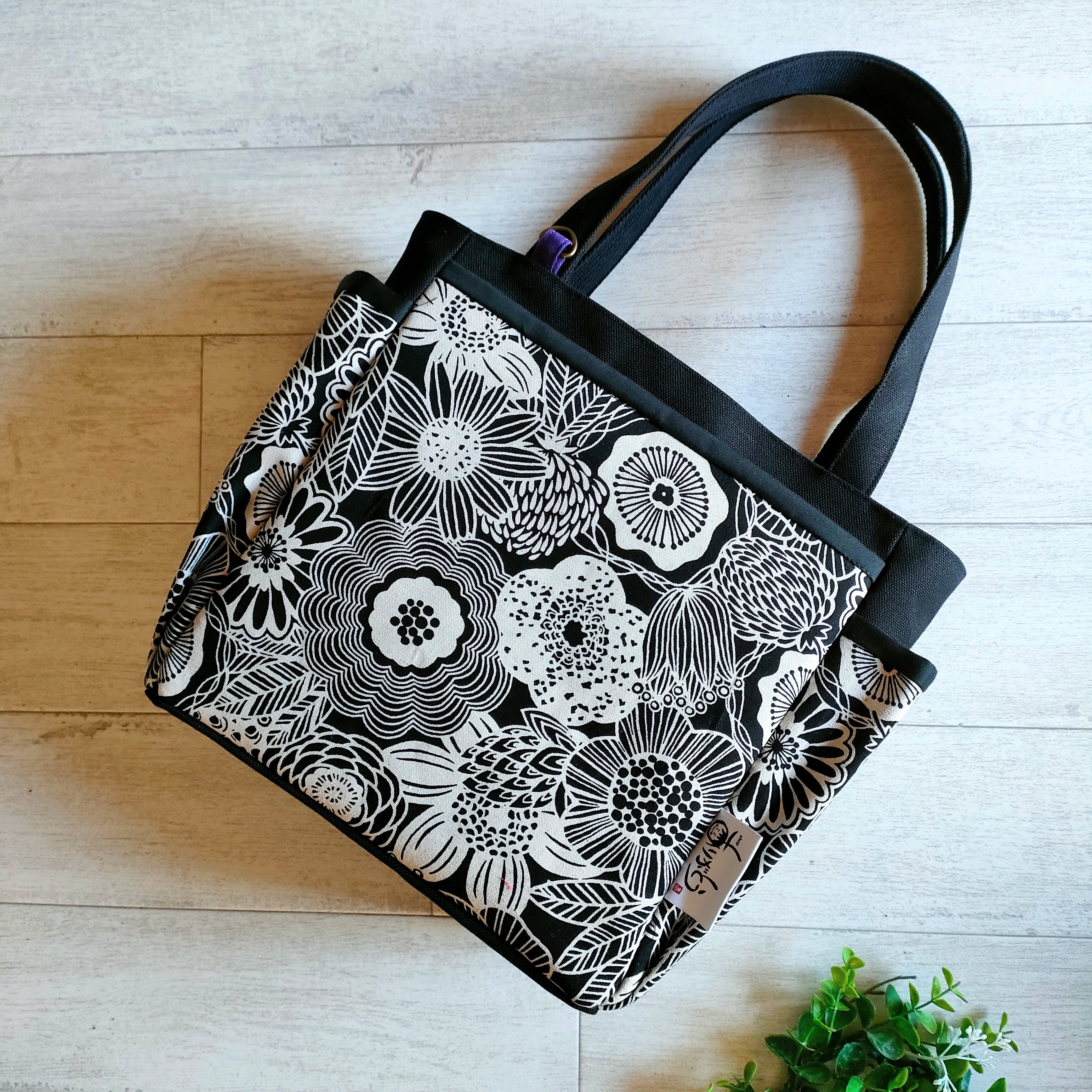 サイドポケット付きトートバッグ中 ボタニカル柄 ボタニカルトートバッグ 花柄トートバック 大人トートバック