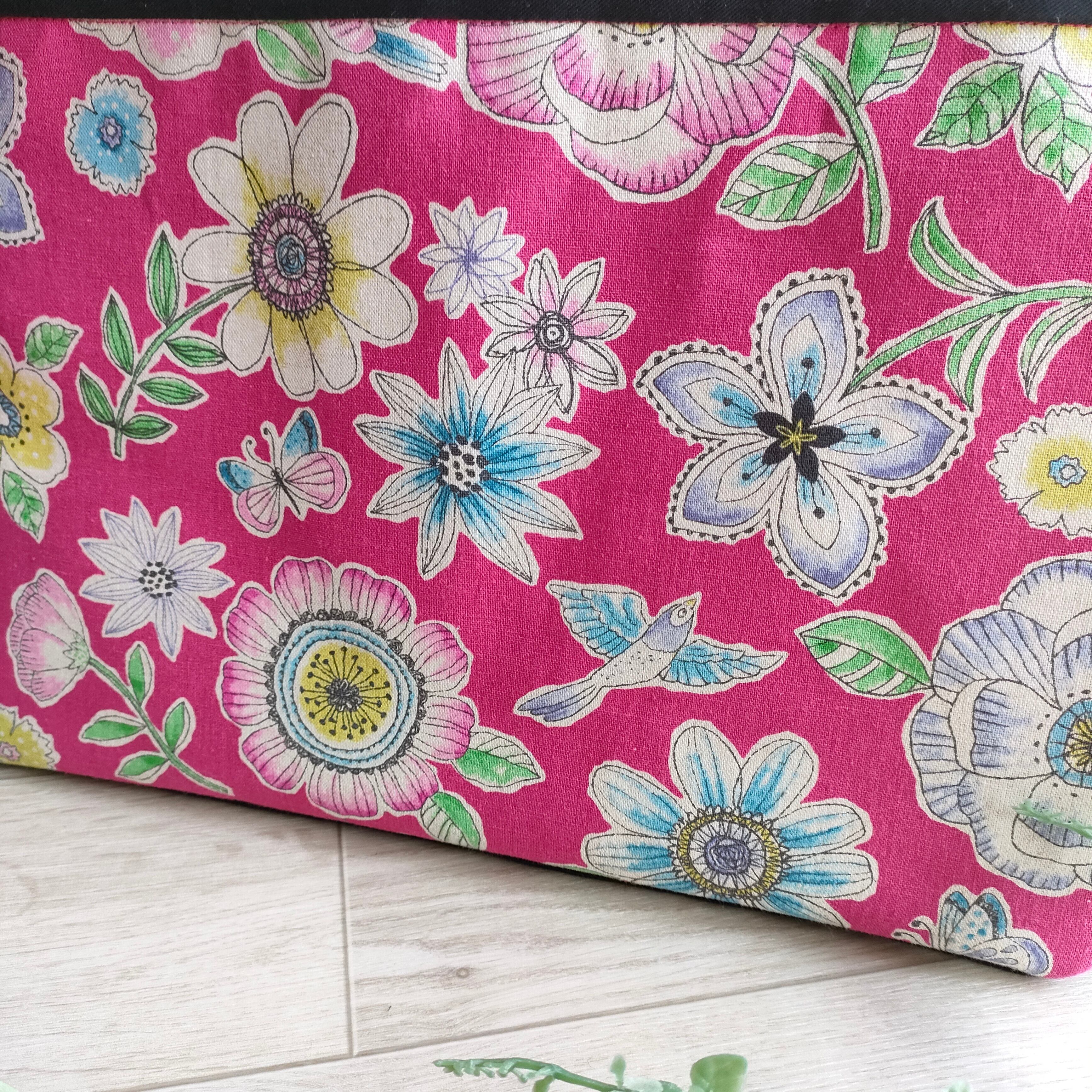 華やかな蝶々や小鳥が描かれたボタニカル柄が目を引く、サイドポケット付きトートバッグ大。