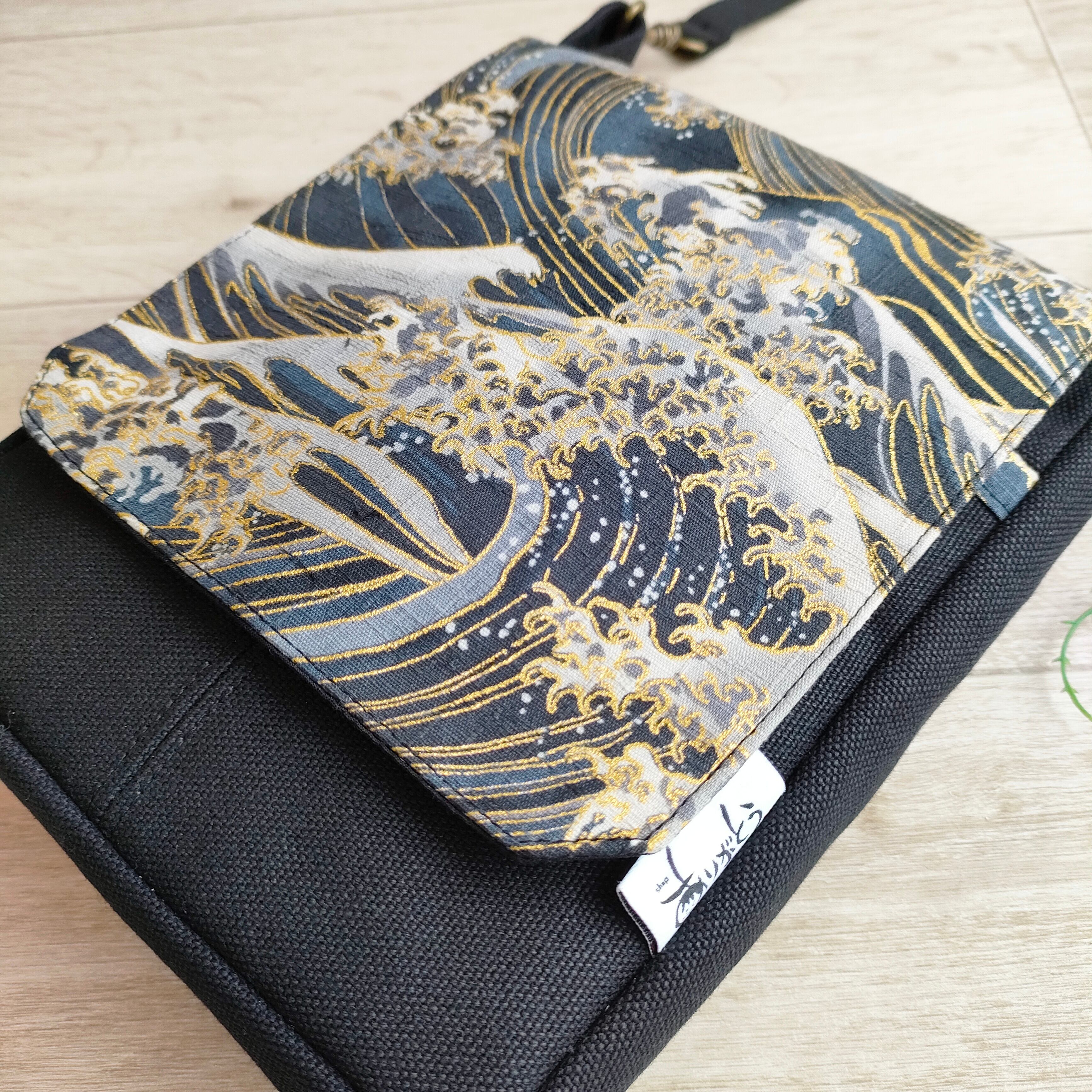 蓋付きサコッシュ 波 日本画 和柄 メンズサコッシュ 男性サコッシュ メンズ浴衣バック